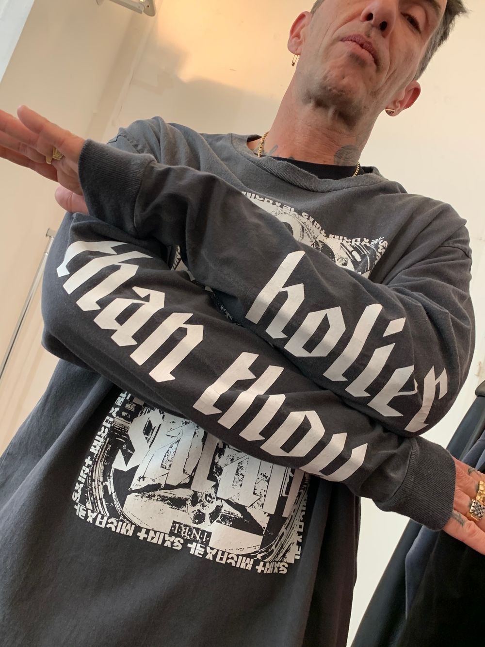 ファーストコレクションでは、HOODIE、SWEAT PULLOVER、T-SHIRTを発表。 全てのアイテムを、特殊ミシンによるフラットシーマで縫製、加えて綿糸の30番手の上質な糸を使用し、なめらかな仕上がりと 快適な気心地を実現しました。高い技術が必要な非常に価値のある製法で仕上げております。さらに、丸胴ボディや手作業の加工 工程、ドラム式の大型タンブラーによる乾燥仕上げなど、よりリアルなヴィンテージ感を再現する拘りが満載。プリントは、 着こんだり洗ったりすると生地表面の毛羽立ちやプリント部分のひび割れが起き、着るほどにヴィンテージのような風合いがあり ながらも、色あせや経年劣化しにくい特殊なプリント手法や染料を使用しております。デザイナー両名のこだわりが詰まった、 着るほどに愛着が沸くコレクションとなっております。