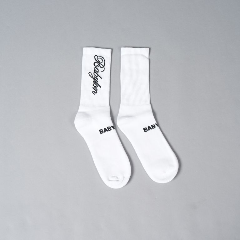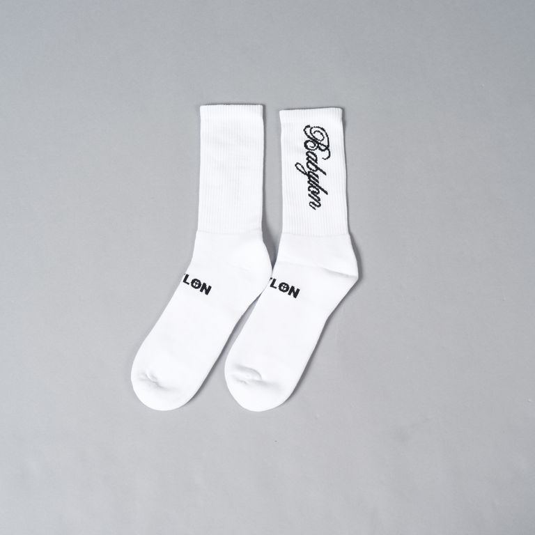 BABYLON LAから登場する、ストリート感漂うホワイトソックス。足の甲部分にはブランドロゴを、サイドにはシグネチャーのアイコン刺繍を配置し、シンプルながら存在感のあるデザインに仕上げられています。