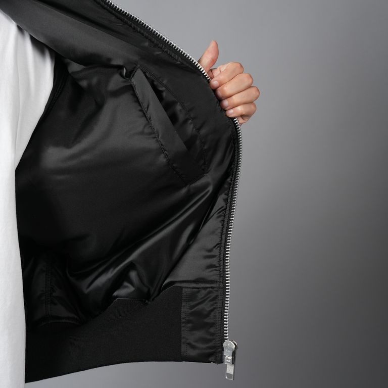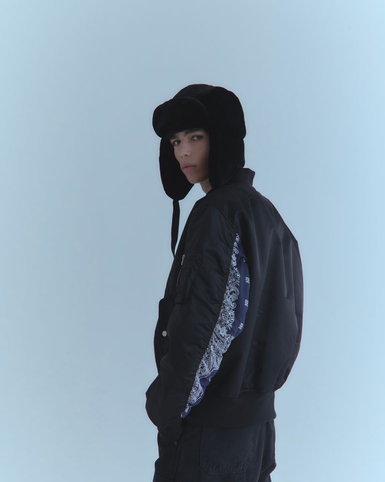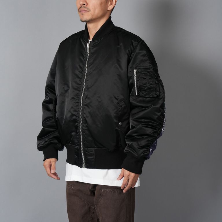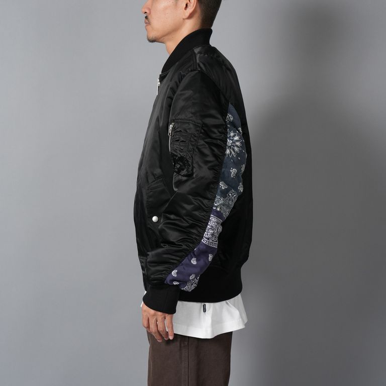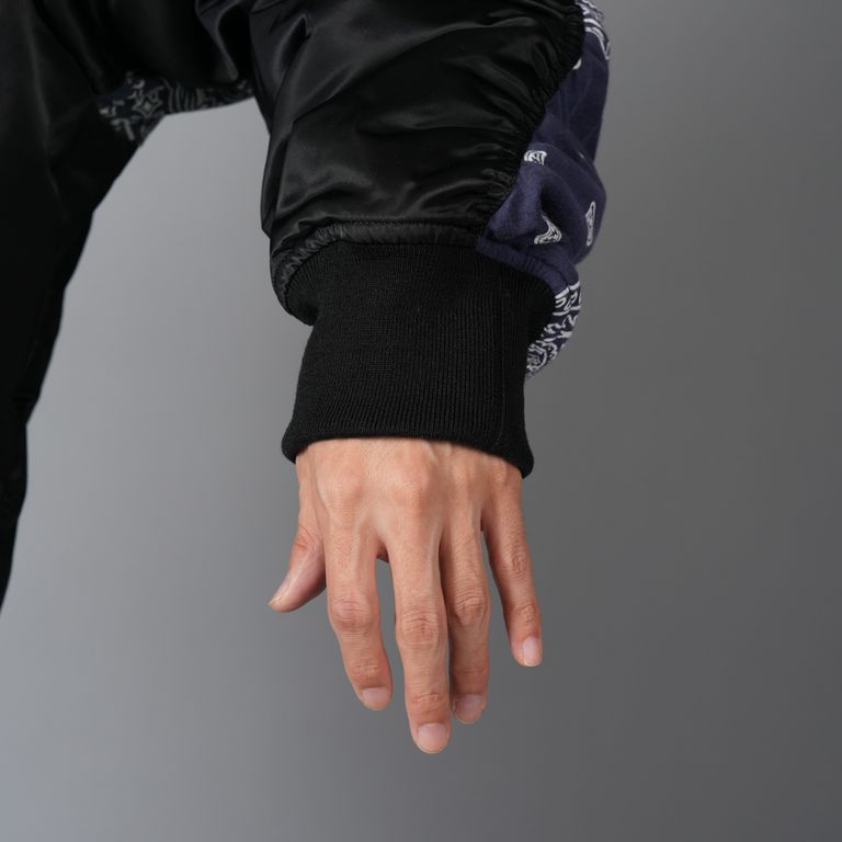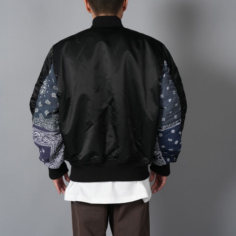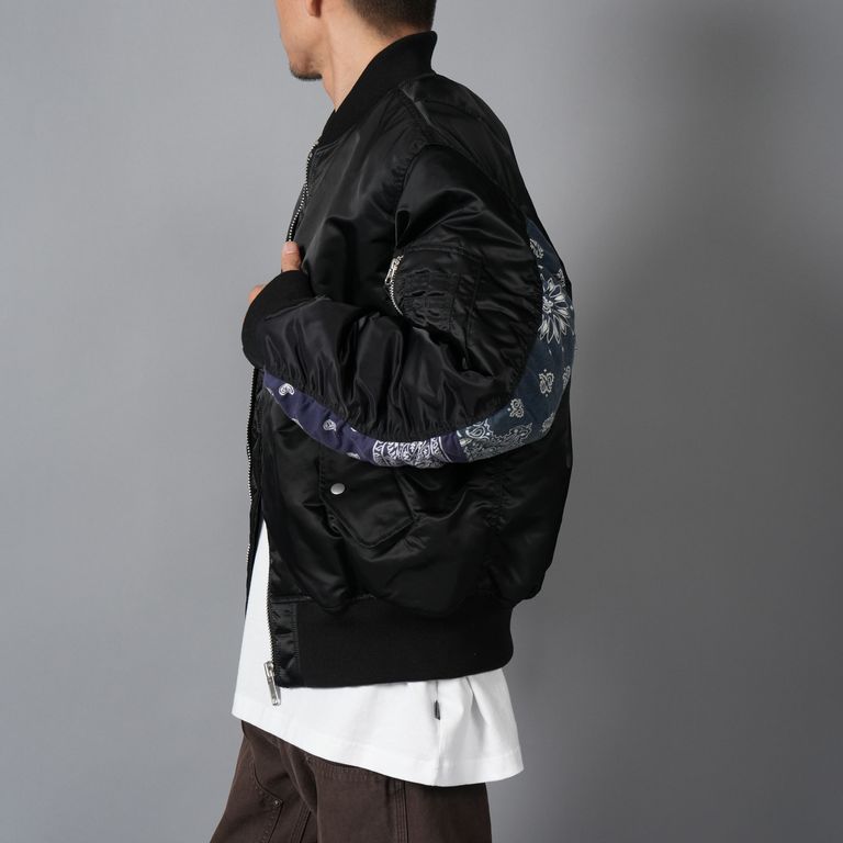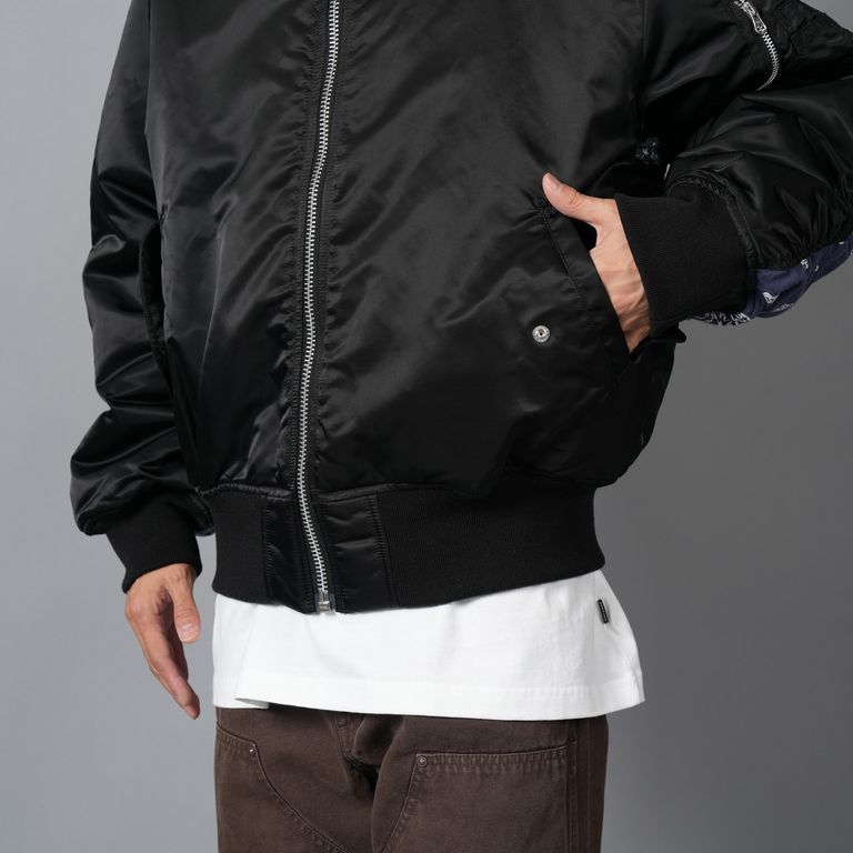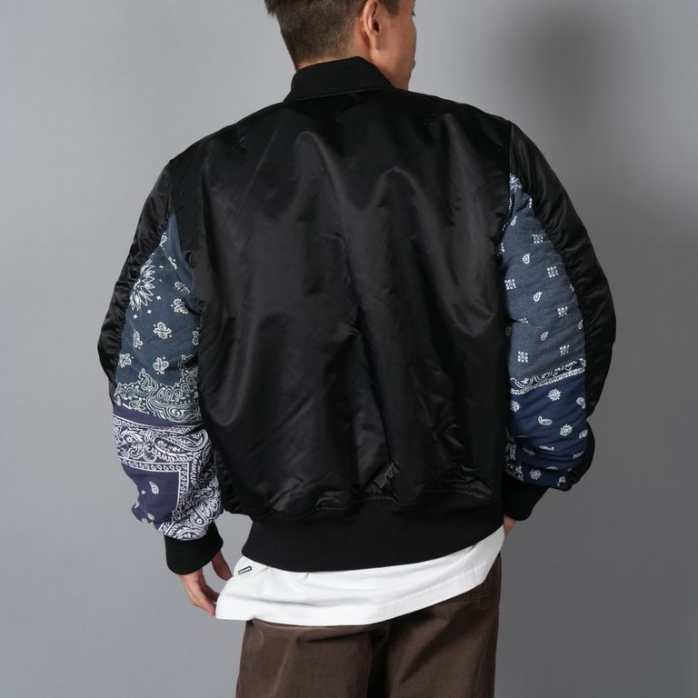ベースには程よい光沢を持つナイロン素材を採用し、MA-1型をベースにしながらも袖部分にUSEDのバンダナを一点一点パッチワークで配置。