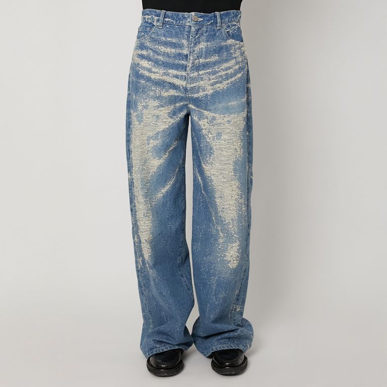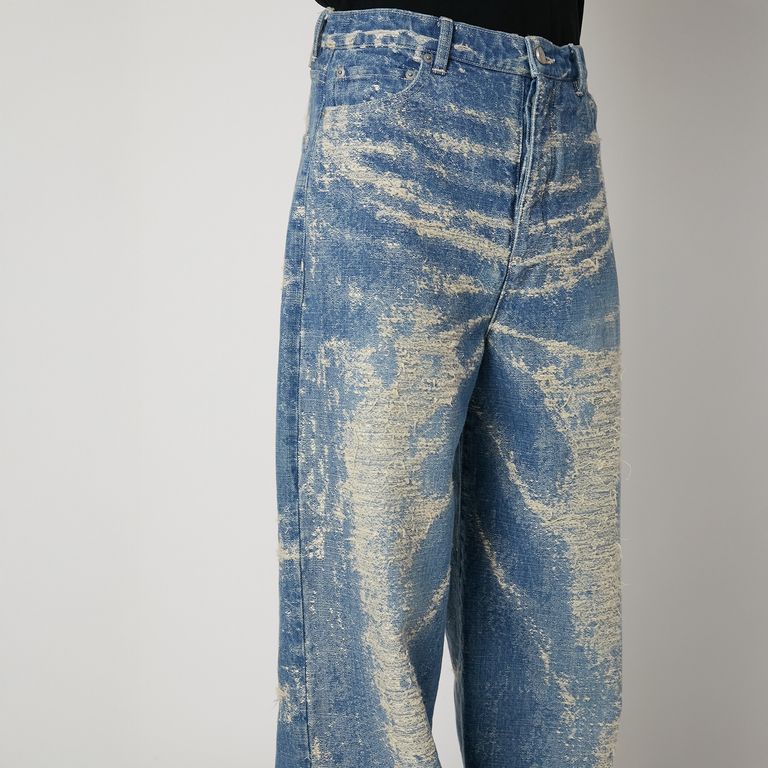 経年変化による色落ちやアタリを、プリントや加工ではなく、ジャカード織りで表現したワイドデニムパンツ。織りの技術で“履き込んだ風景”を描き出す、TAAKKならではの実験的アプローチ。 綿100%
