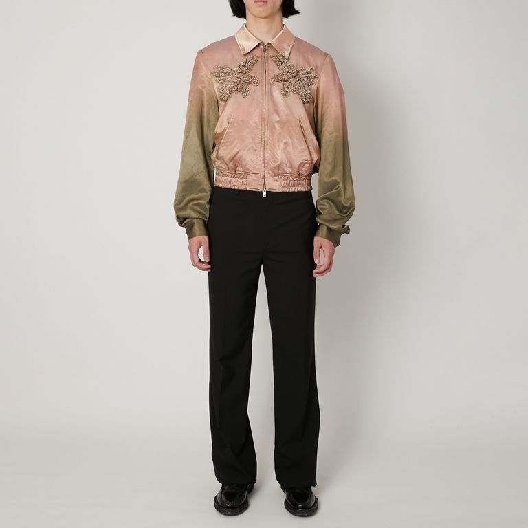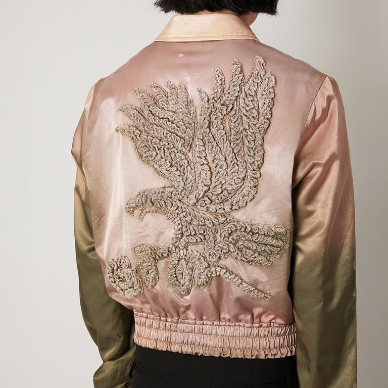 光沢のあるサテン地に、彫刻的な立体刺繍でワシのモチーフを描いた襟付きのスーベニアジャケット。 仕上げにブリーチ剤を用いて染色の濃淡を加えることで、奥行きと表情を生み出しています。 刺繍の質感とブリーチによる不規則なグラデーションが交差し、彫刻的刺繍と染色、ふたつの手仕事が共存する一着です。