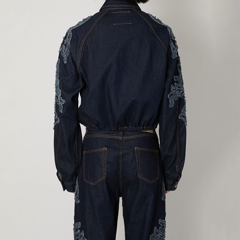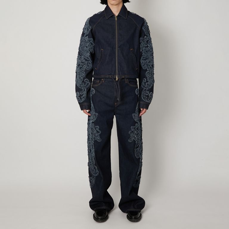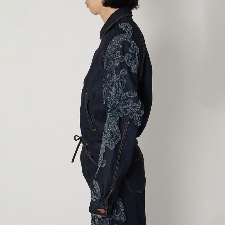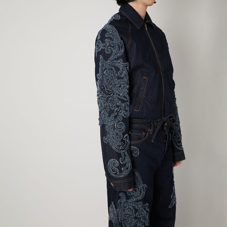 12オンスのデニム素材に、立体的で存在感のある彫刻刺繍を施したブルゾン。 左右の袖にだけ大胆に配置した刺繍が、ワークウェアの素朴さと装飾の豊かさを同時に感じさせるユニークなバランスを生んでいる。 深みのあるインディゴの「ワンウォッシュタイプ」と、明るく軽快な表情の「ブラストブリーチタイプ」の2種を展開。