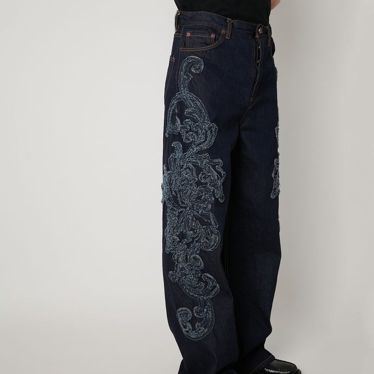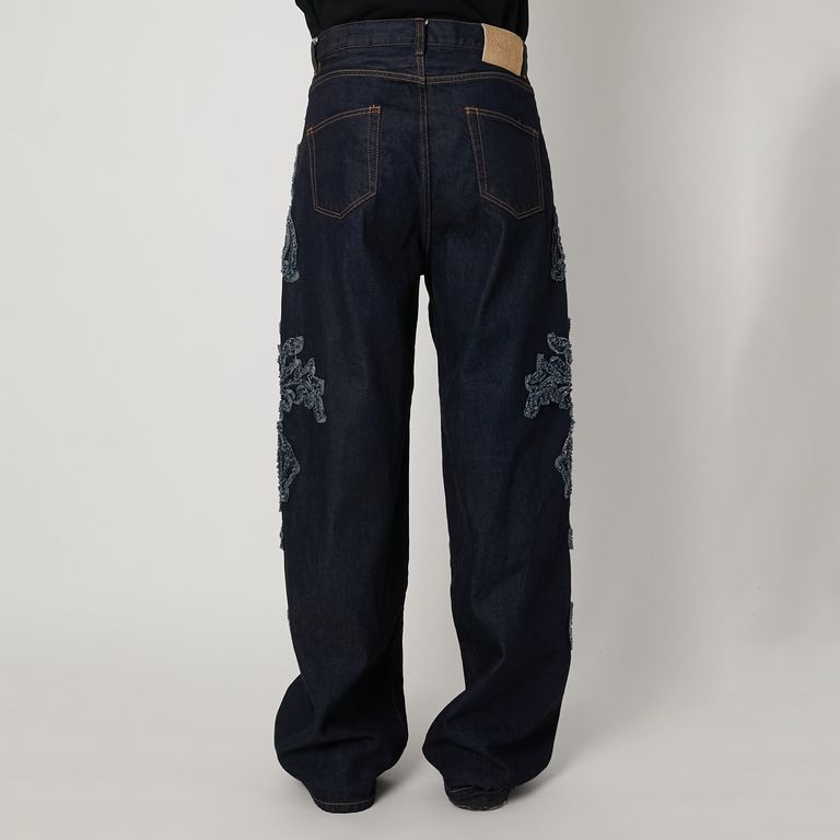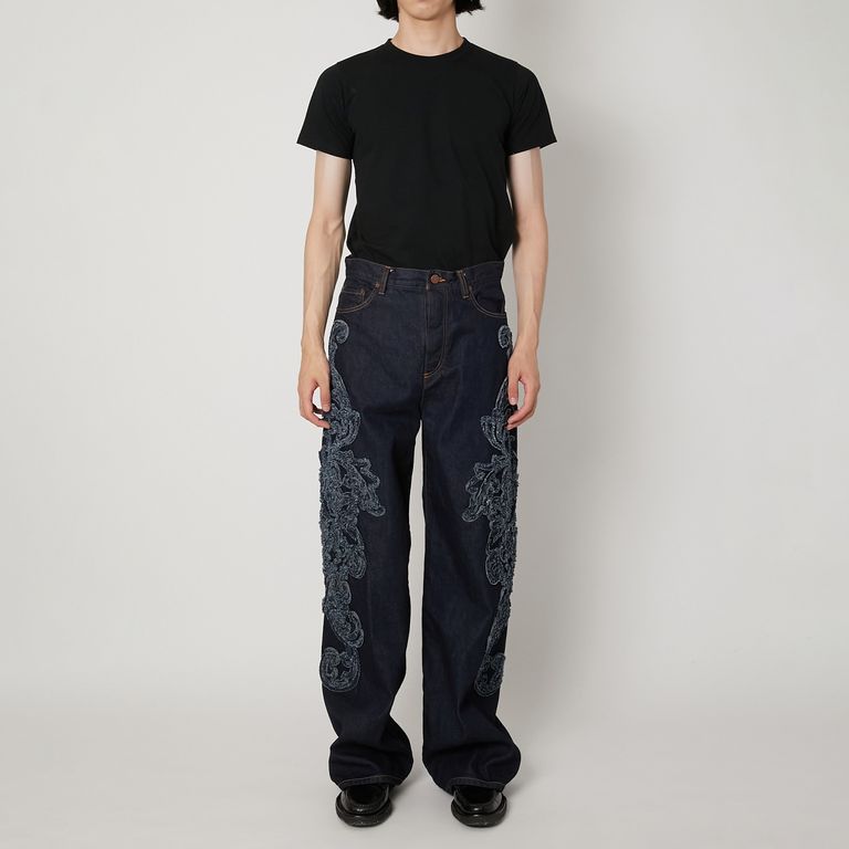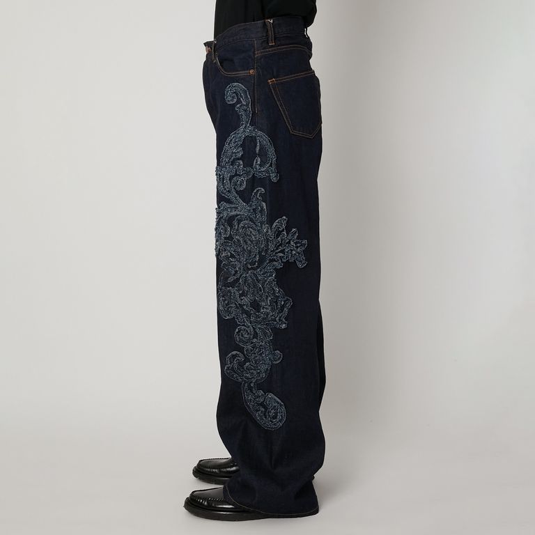 12オンスのデニム素材に、立体的で存在感のある彫刻刺繍を施した5ポケットパンツ 左右の脇に大胆に配置した刺繍が、ワークウェアの素朴さと装飾の豊かさを同時に感じさせるユニークなバランスを生んでいる。 深みのあるインディゴの「ワンウォッシュタイプ」と、明るく軽快な表情の「ブラストブリーチタイプ」の2種を展開。