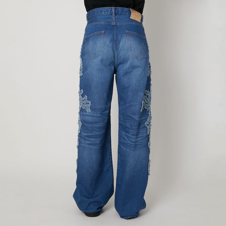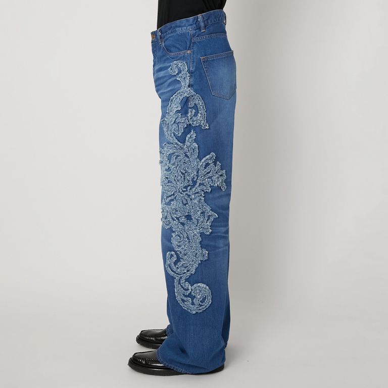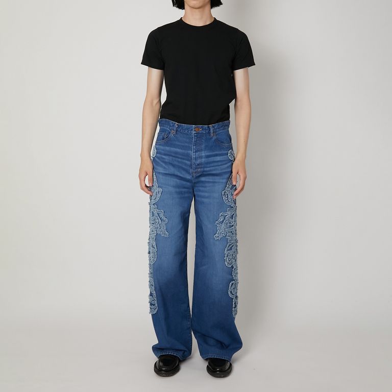 12オンスのデニム素材に、立体的で存在感のある彫刻刺繍を施した5ポケットパンツ 左右の脇に大胆に配置した刺繍が、ワークウェアの素朴さと装飾の豊かさを同時に感じさせるユニークなバランスを生んでいる。 深みのあるインディゴの「ワンウォッシュタイプ」と、明るく軽快な表情の「ブラストブリーチタイプ」の2種を展開。