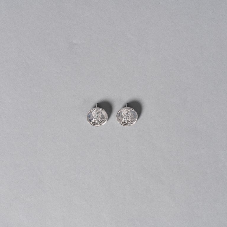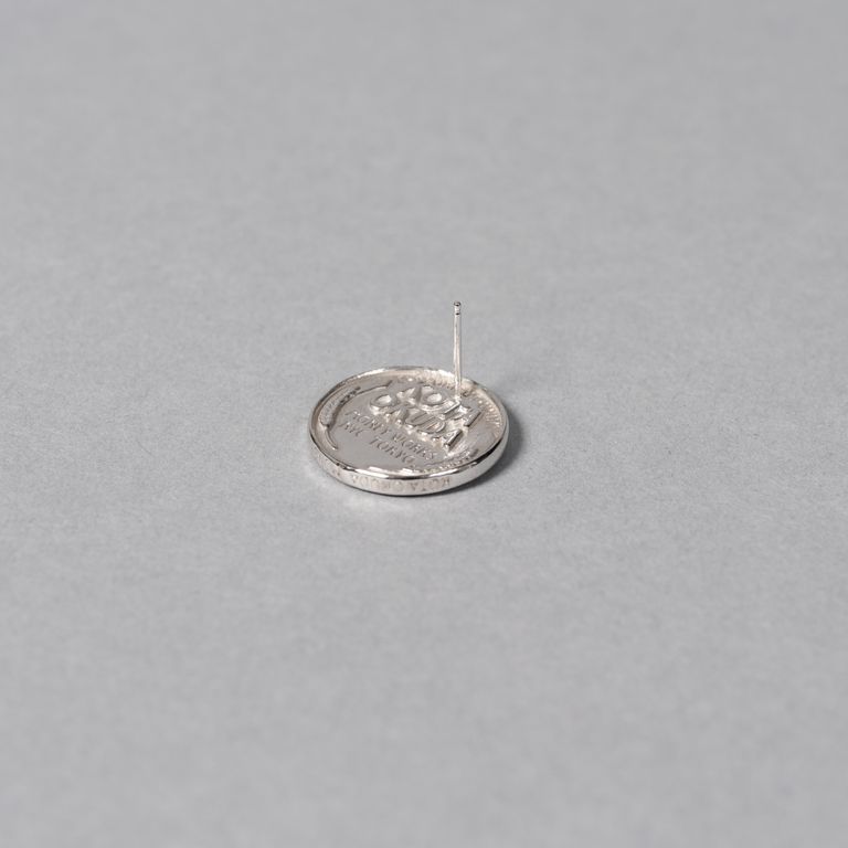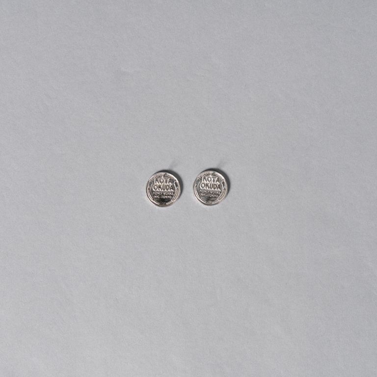 KOTA OKUDAらしく、通貨の記号性をアクセサリーに置き換えたスタッドピアスです。片面はポートレート、もう片面にはKOTA OKUDAの刻印が入り、さりげないのにしっかり「ネタ」がある仕上がり。