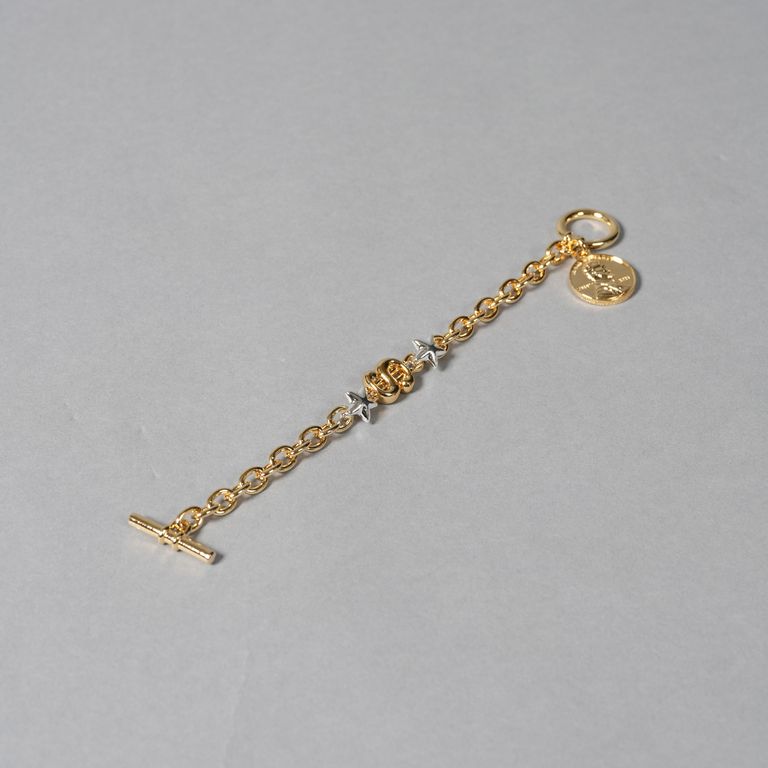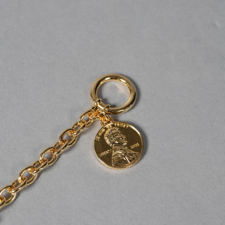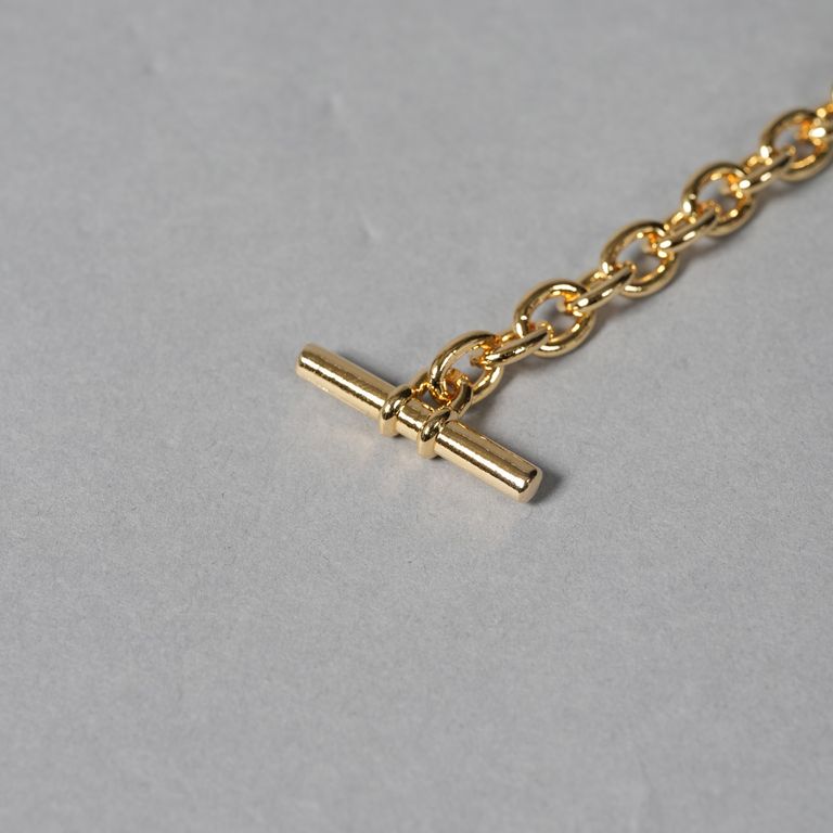 クラシックなチェーンに、コインチャームを添えたブレスレット。留め具は**トグル(Tバー)仕様で、着脱もスムーズ。手元にさりげない“重み”を足して、スタイルを締めてくれます。