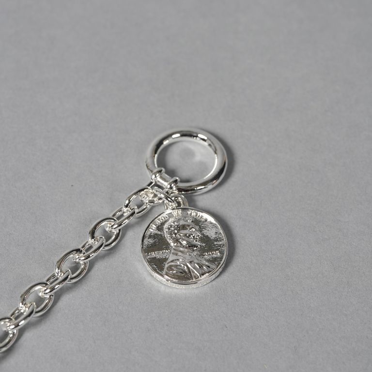 クラシックなチェーンに、コインチャームを添えたブレスレット。留め具は**トグル(Tバー)仕様で、着脱もスムーズ。手元にさりげない“重み”を足して、スタイルを締めてくれます。